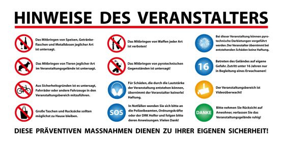 - Nicht Erlaubt sind: Glasflaschen und Dosen, Waffen, Tiere,
